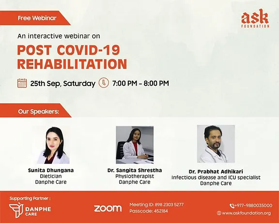 An interactive Post Covid-19 Rehabilitation webinar was held on 25th Sep 2021 by Dietician Sunita Dhungana, Dr. Sangita Shrestha and Dr. Prabhat Adhikari.