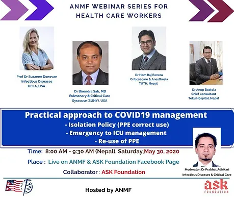 On Saturday, May 30, 2020, we hosted an in-depth webinar for doctors and nurses, guiding participants through a virtual patient journey from Emergency to ICU and discharge. The session covered practical scenarios such as isolation policies, correct use of PPE, emergency and ICU care, PPE reuse, and sterilization practices. International and national experts in Infectious Diseases and Critical Care led the discussions. The webinar was broadcast live on the ASK Foundation and ANMF pages from 8:00 AM to 9:30 AM Nepal Time.