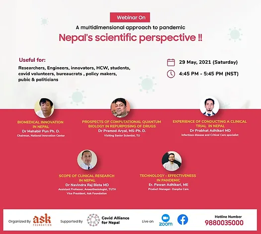 ASK Foundation, in collaboration with Covid Alliance for Nepal, organized a webinar on “A Multidimensional Approach to Pandemic - Nepal’s Scientific Perspective” on 29 May 2021, Saturday, at 4:45 PM (NST). The webinar featured experts from their respective fields who shared scientific talks on five different topics, each lasting 10 minutes, followed by a Q\&A session.