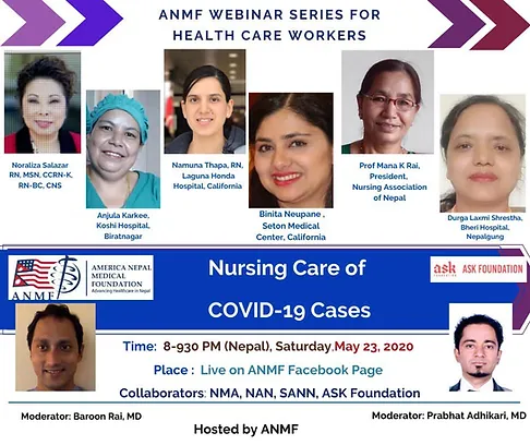 A crucial training webinar for nurses in response to the ongoing COVID-19 crisis was conducted on On Saturday, May 23, 2020. Recognizing the vital role of nurses as frontline workers, the ASK Foundation collaborated with the America Nepal Medical Foundation (ANMF) to deliver this training. The session featured nursing leaders and on-field nurses from the USA, who shared their firsthand experiences and protocols for managing COVID-19 patients. Our Nepali counterparts also contributed by discussing their own experiences and concerns. The webinar was broadcast live on the ASK Nepal account and the ANMF page at 8:30 PM Nepal Time.