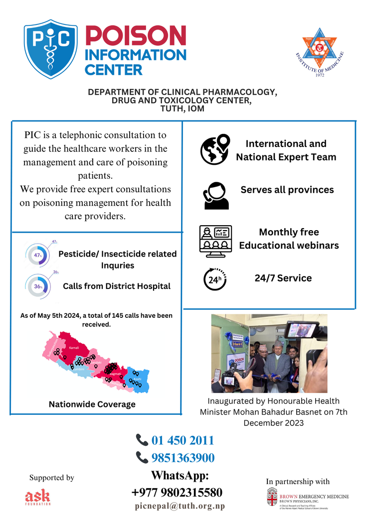The center is operating in collaboration with Brown University as key international academic partner and Department of Clinical Pharmacology, Tribhuvan University Teaching Hospital as an implementing partner and ASK Foundation as a logistic partner. PIC was inaugurated by then honourable health minister Mohan Bahadur Basnet on December 7, 2023. Within the six months since its inauguration, PIC has received 187 calls from all over the provinces of Nepal. A robust support system involving 12 national and 14 international experts has been established to provide backup support to the SPIs, ensuring comprehensive guidance for complex cases. Additionally, it also conducts monthly webinars with international expert speakers on various important topics. Some of these webinars had participants reaching more than 200.